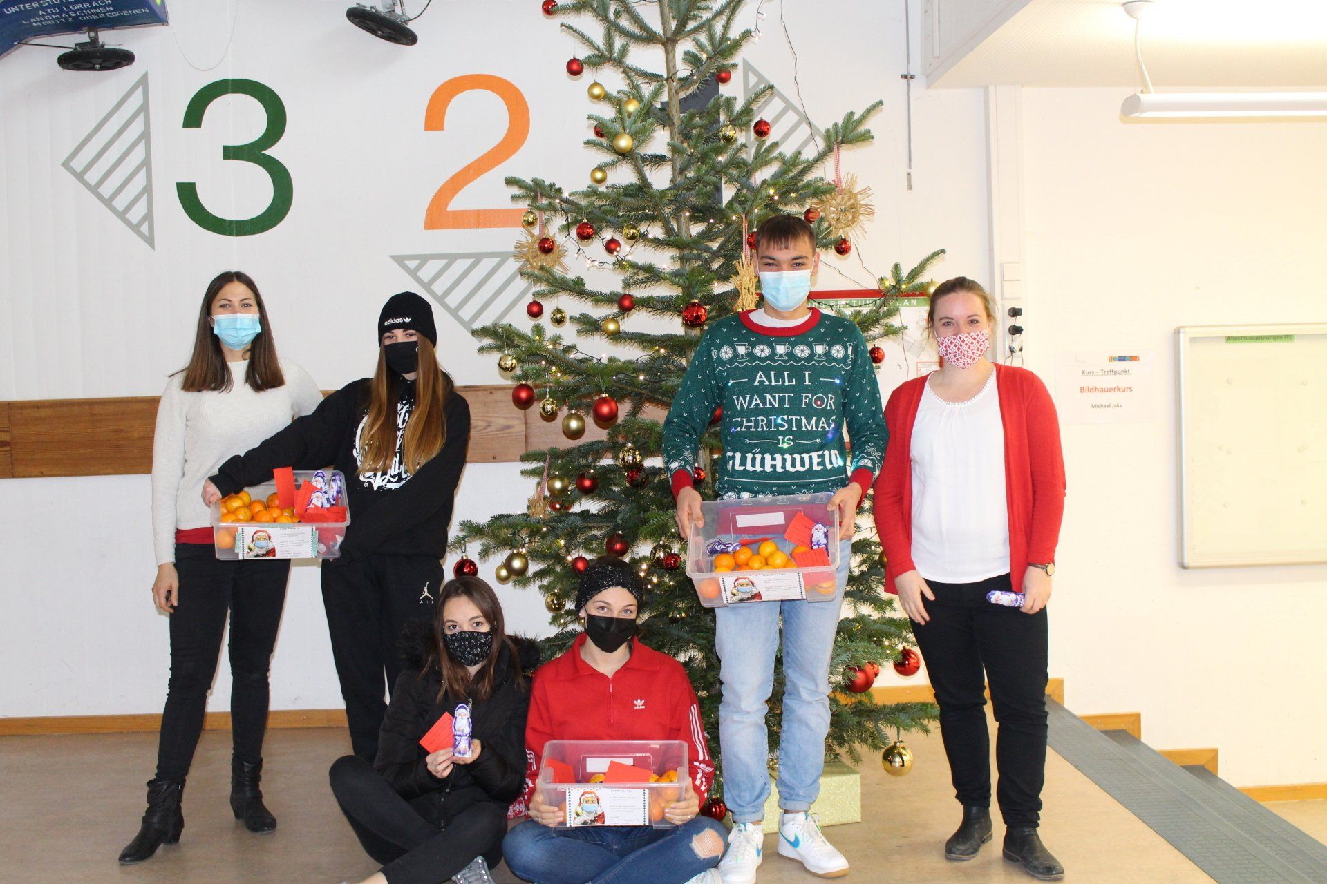 Neben den SMV-Sitzungen, die nun aufgrund der Sicherheitsbestimmungen in der Sporthalle stattfinden, haben sich die Schülersprecherinnen und Schülersprecher Kiara, Carina, Mara und Felix (Klassen 9 und 10) mit ihren Verbindungslehrerinnen Frau Gärtner und Frau Himmelsbach auch etwas für die Adventszeit ausgedacht.